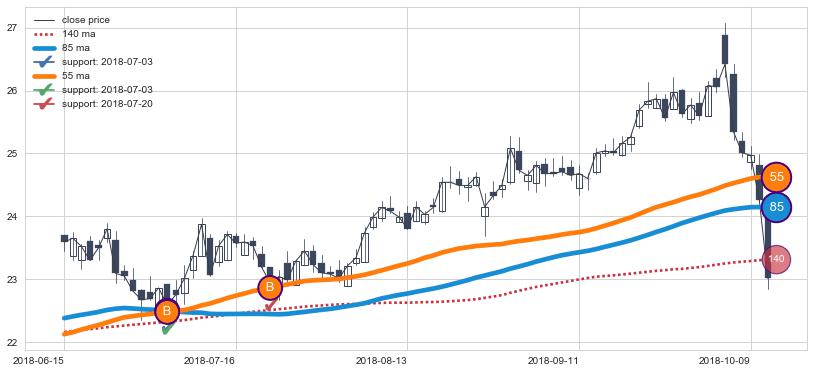 上涨趋势2018-06-15-2018-10-11,均线85, 55确认关键支撑2处