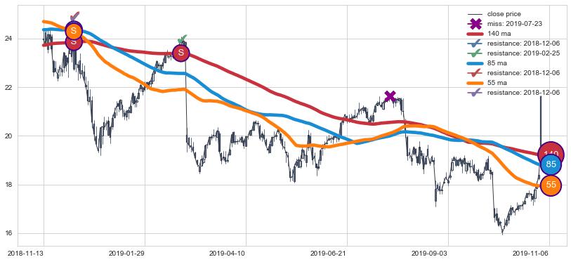 下跌趋势2018-11-13-2019-11-06,均线140, 85, 55确认关键阻力2处