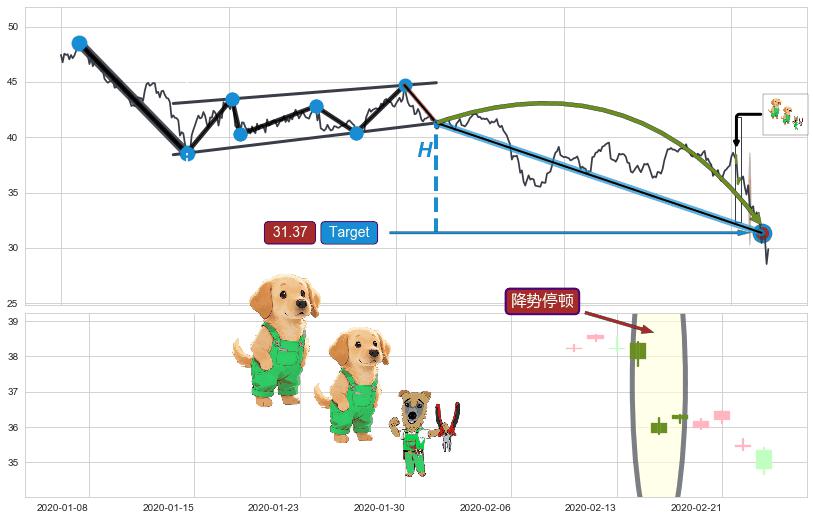 ➢ 【多方力量耗尽】已在2020-02-18突破矩形提供的【支撑】颈线 36.06 →箱形震荡盘整结束