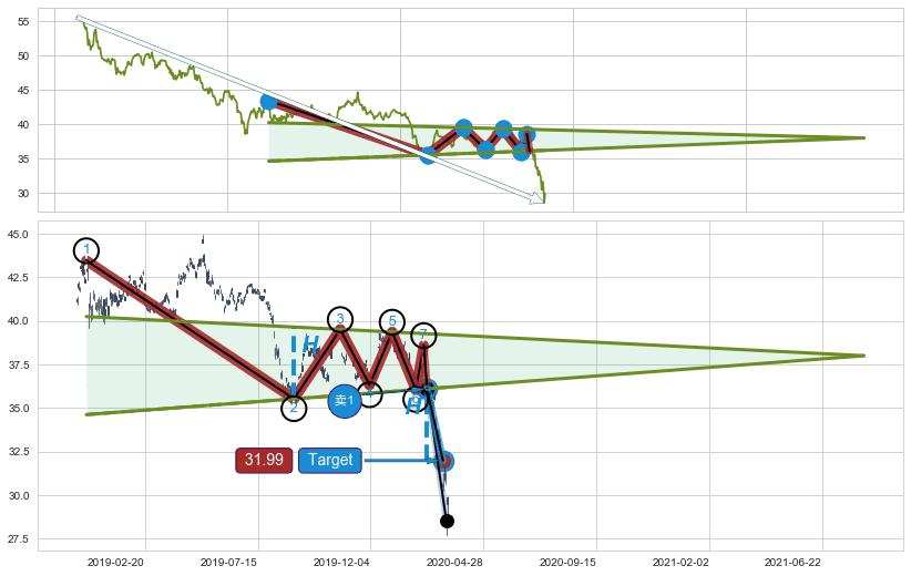 ➣ 【多空双方观望→争持→促使价格波动日益狭窄→空方打破攻守平衡点】对称三角形中继整理, 已在2020-02-18突破【支撑】颈线 36.11 →演变成下降通道