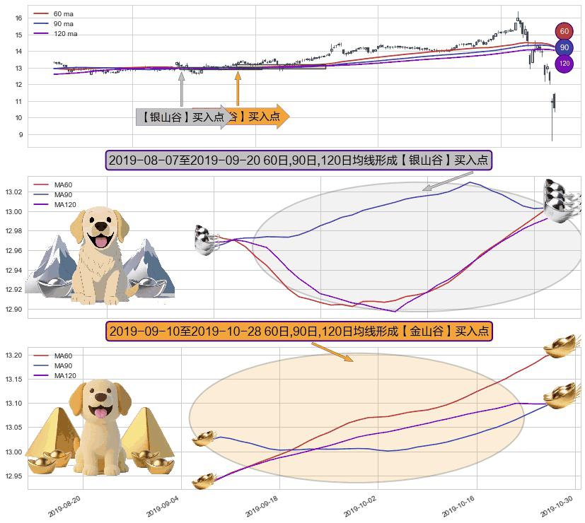 ⚀ 2019-09-11-日至2019-10-28-日显现 60日-90日-120日均线 【金山谷】买入点 其再次确认了买入信号,可靠性更强,买入