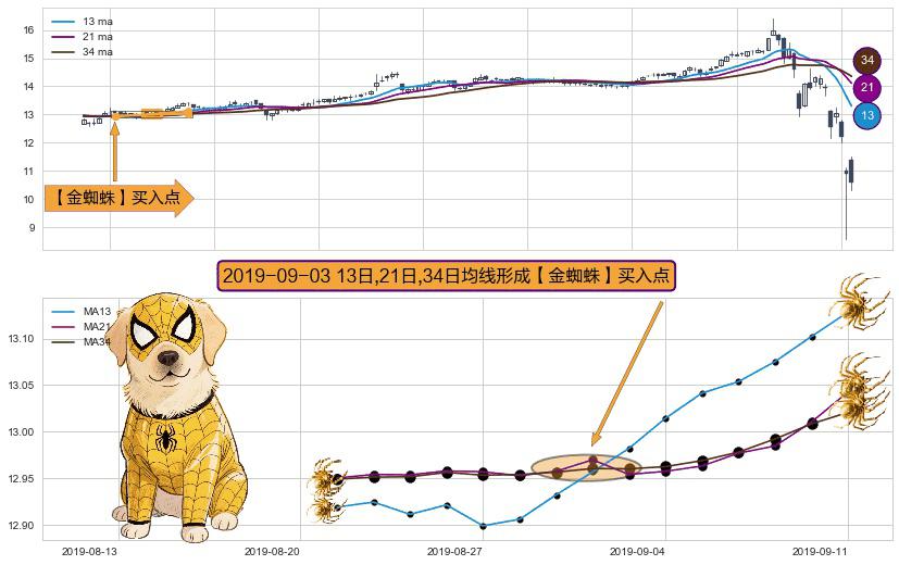 ⚀ 2019-09-03日显现 13日-21日-34日均线 【金蜘蛛】买入点 看多信号,后市看涨,买入