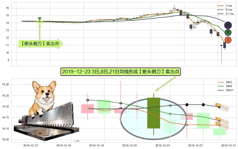 ⚀ 2019-12-23日显现 3日-8日-21日均线 【断头铡刀】卖出点 看空信号,后市看跌,卖出