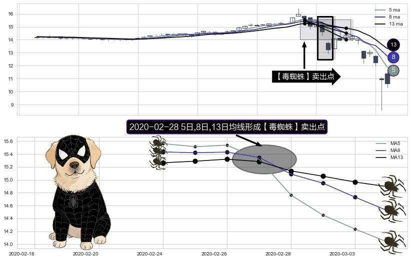 ⚀ 2020-02-28日显现 5日-8日-13日均线 【毒蜘蛛】卖出点 看空信号,后市看跌,卖出