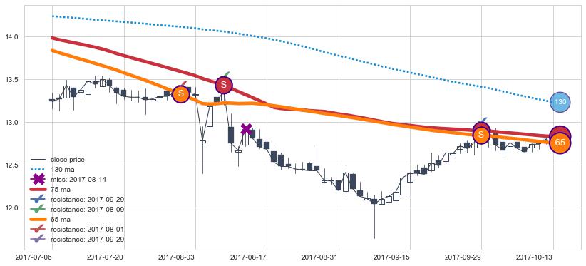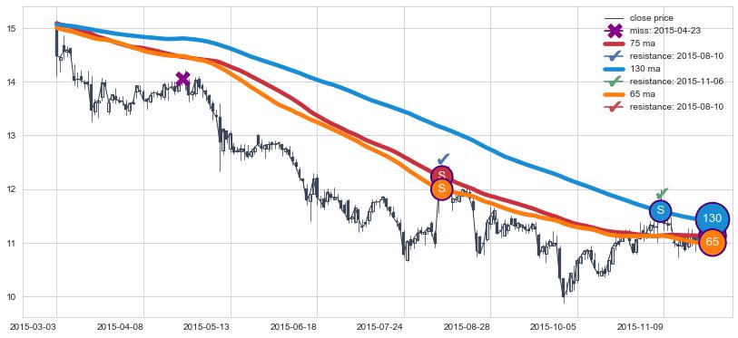 ➢ 最优均线组合共正确确认支撑阻力信号7处,正确确认率 43.75%