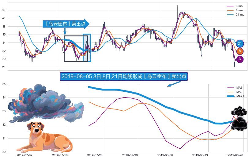 ⚀ 2019-07-19日-2019-08-19日显现 3日-8日-21日均线 【乌云密布】卖出点 看空信号,后市看跌,卖出