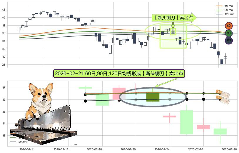 ⚀ 2020-02-21日显现 60日-90日-120日均线 【断头铡刀】卖出点 看空信号,后市看跌,卖出