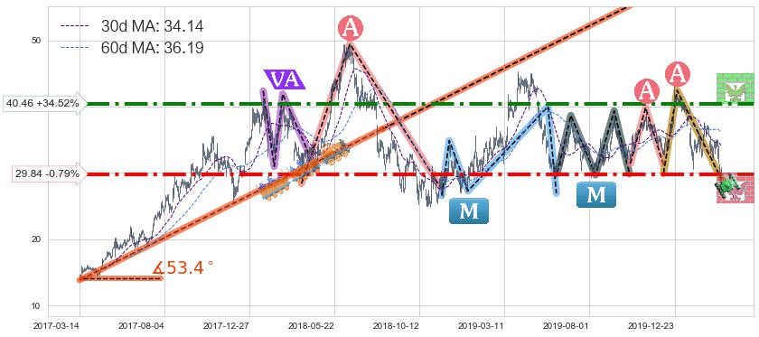 ♘ 阻力价格位40.46,可信任强度84.06%,距离最后交易2020-03-13形成的收盘价格30.08相差 +34.52%