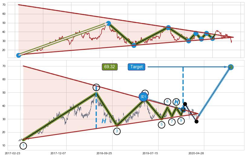 ➢ 最小中继整理涨幅→𝐇: 32.24 (高点逐步降低斜边第一阻力点②与支撑边垂直距离)