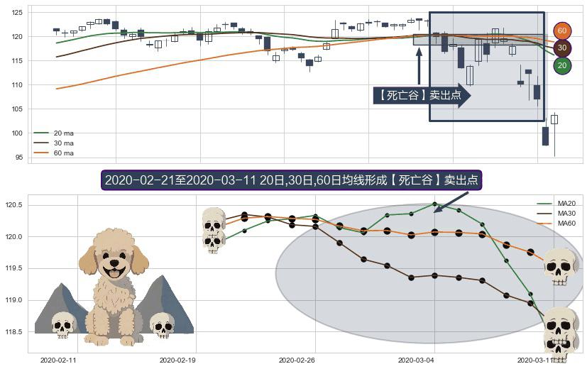 ⚂ 【死亡谷】卖出点 由MA20均线下穿MA30均线和MA60均线,MA30均线下穿MA60均线形成