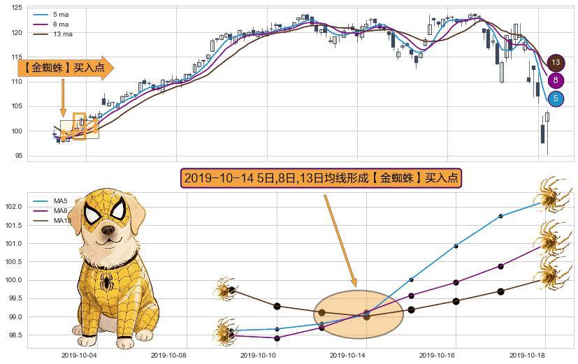 ⚀ 2019-10-14日显现 5日-8日-13日均线 【金蜘蛛】买入点 看多信号,后市看涨,买入