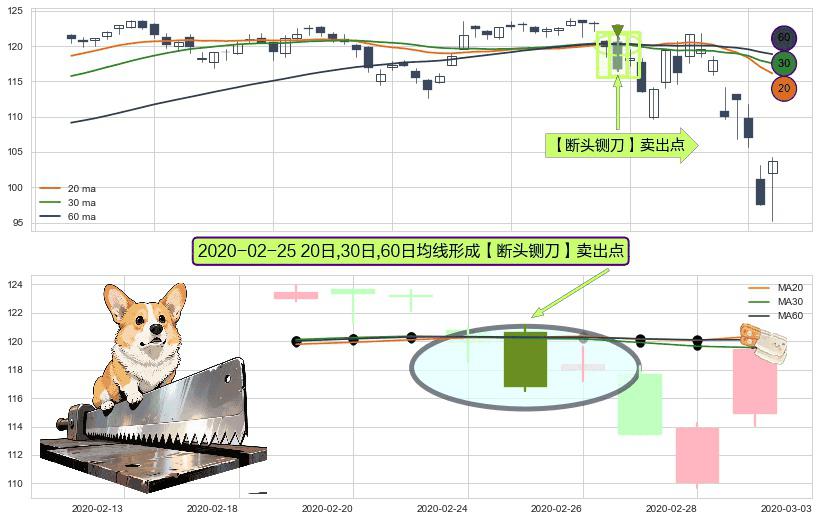 ⚀ 2020-02-25日显现 20日-30日-60日均线 【断头铡刀】卖出点 看空信号,后市看跌,卖出