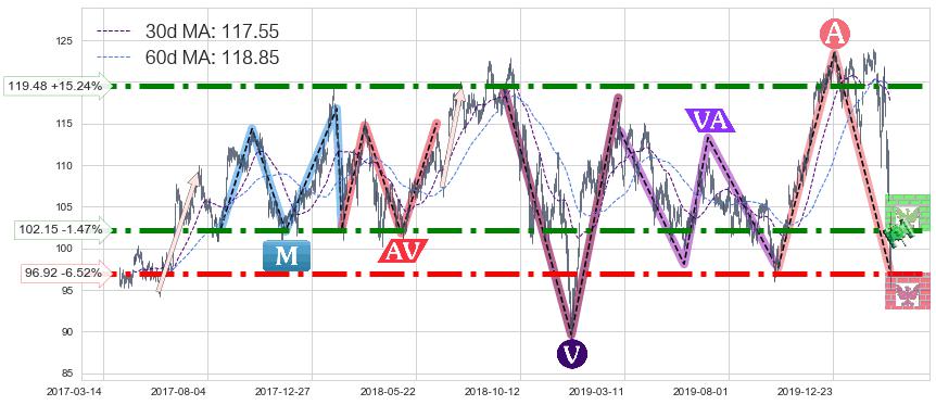 ♘ 支撑价格位96.92,可信任强度96.38%,距离最后交易2020-03-13形成的收盘价格103.68相差 -6.52%