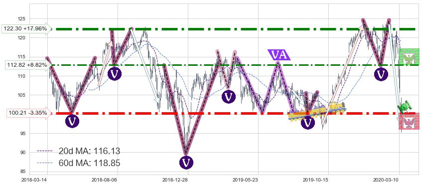 ♘ 阻力价格位112.82,可信任强度65.63%,距离最后交易2020-03-13形成的收盘价格103.68相差 +8.82%