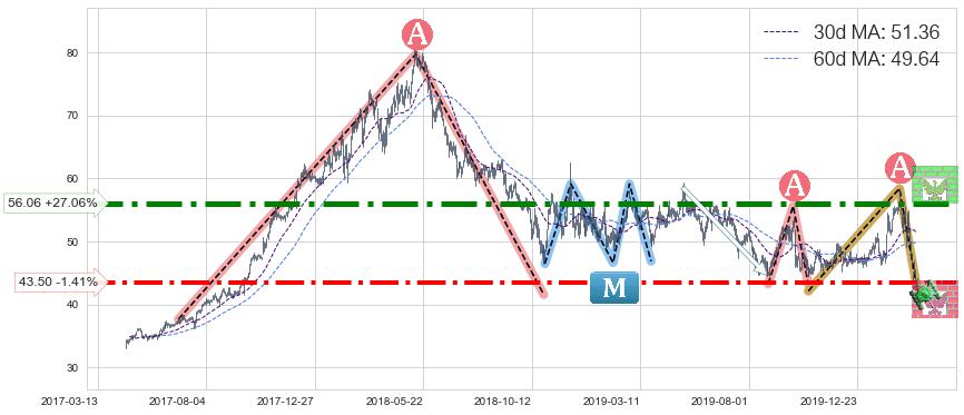 ♘ 支撑价格位43.50,可信任强度74.29%,距离最后交易2020-03-13形成的收盘价格44.12相差 -1.41%