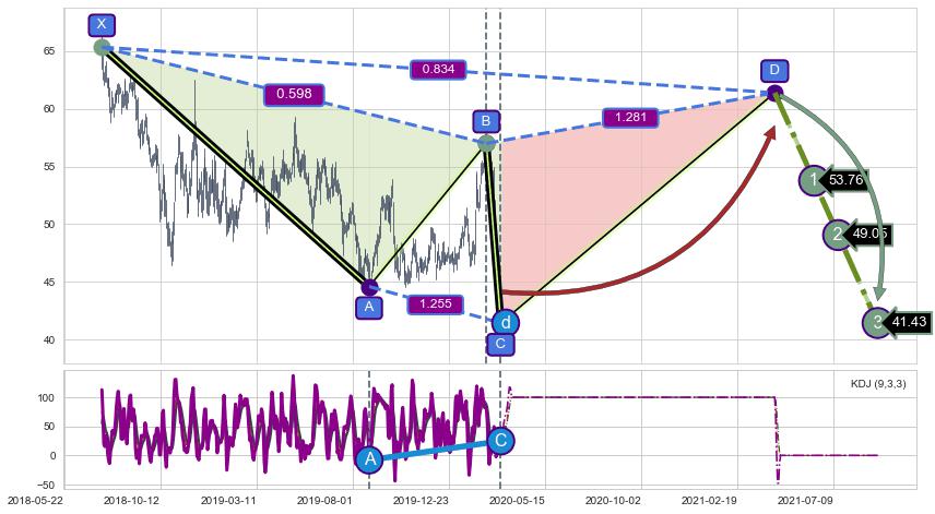 ➣ D点拟合预测价格61.38,距离最后交易收盘价格44.12相差 +39.13%