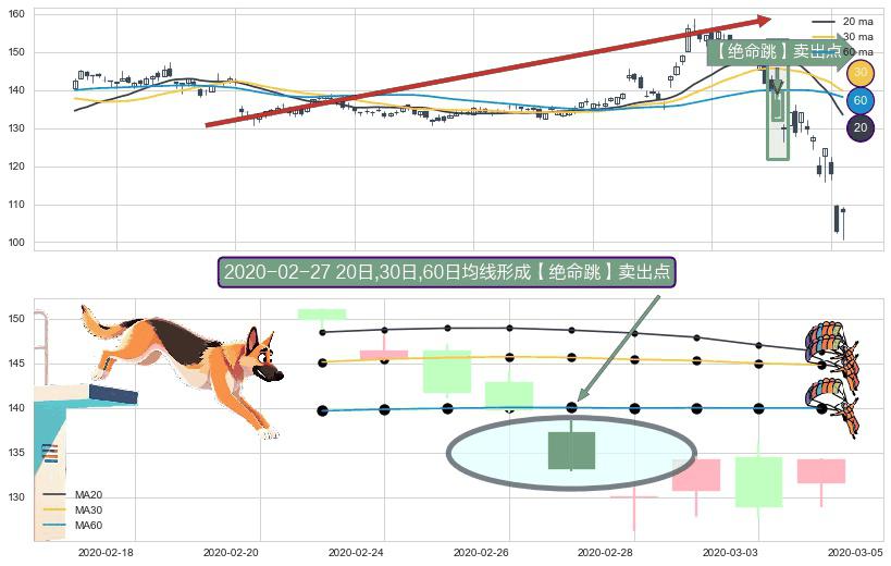 形态多维评估: ⚀ 2020-02-27日显现 20日-30日-60日均线 【绝命跳】卖出点 看空信号,后市看跌,卖出