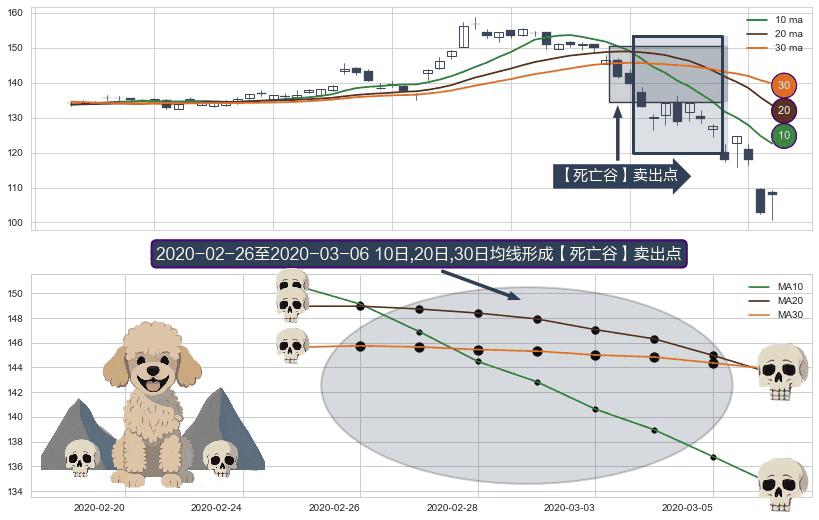 ⚂ 【死亡谷】卖出点 由MA10均线下穿MA20均线和MA30均线,MA20均线下穿MA30均线形成