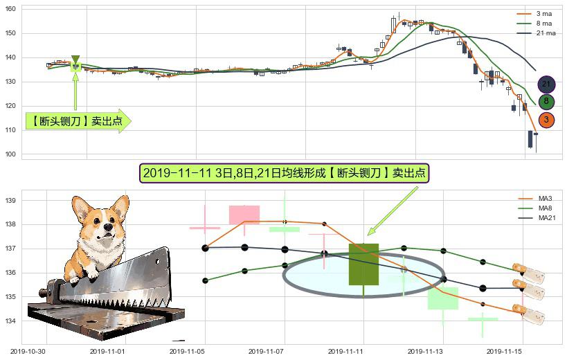 形态多维评估: ⚀ 2019-11-11日显现 3日-8日-21日均线 【断头铡刀】卖出点 看空信号,后市看跌,卖出