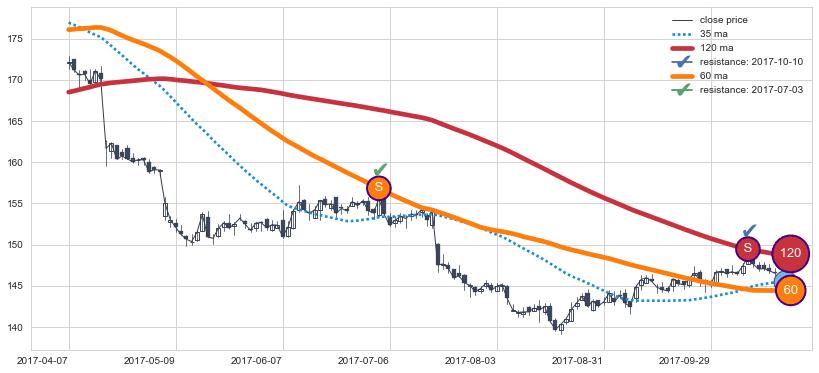 下跌趋势2017-04-07-2017-10-17,均线120, 60确认关键阻力2处