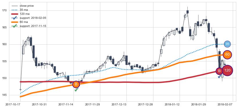 上涨趋势2017-10-17-2018-02-07,均线120, 60确认关键支撑2处