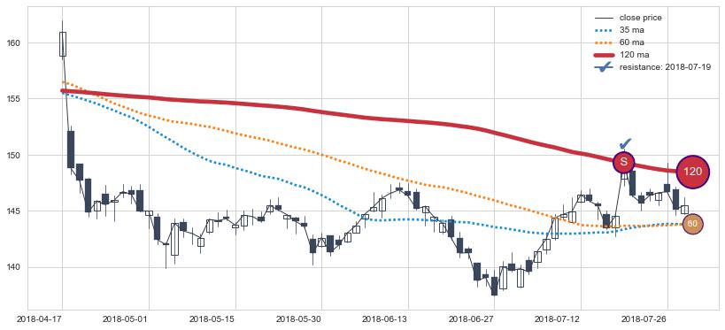 下跌趋势2018-04-17-2018-07-30,均线120确认关键阻力1处