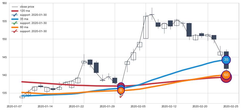 上涨趋势2020-01-07-2020-02-25,均线120, 35, 60确认关键支撑1处