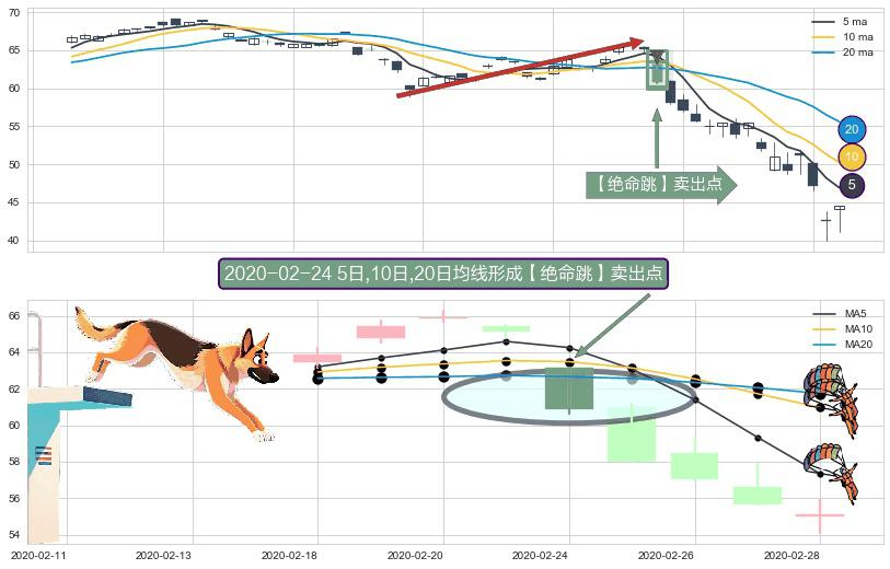 形态多维评估: ⚀ 2020-02-24日显现 5日-10日-20日均线 【绝命跳】卖出点 看空信号,后市看跌,卖出