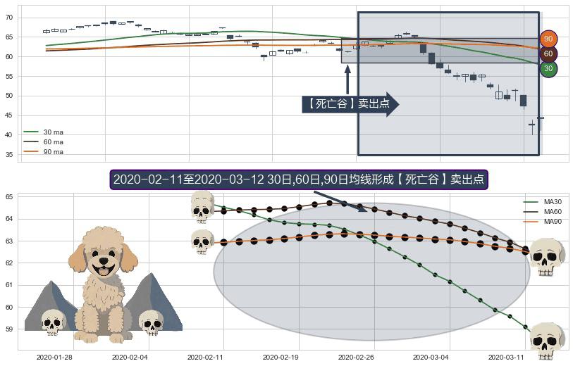 ⚂ 【死亡谷】卖出点 由MA30均线下穿MA60均线和MA90均线,MA60均线下穿MA90均线形成