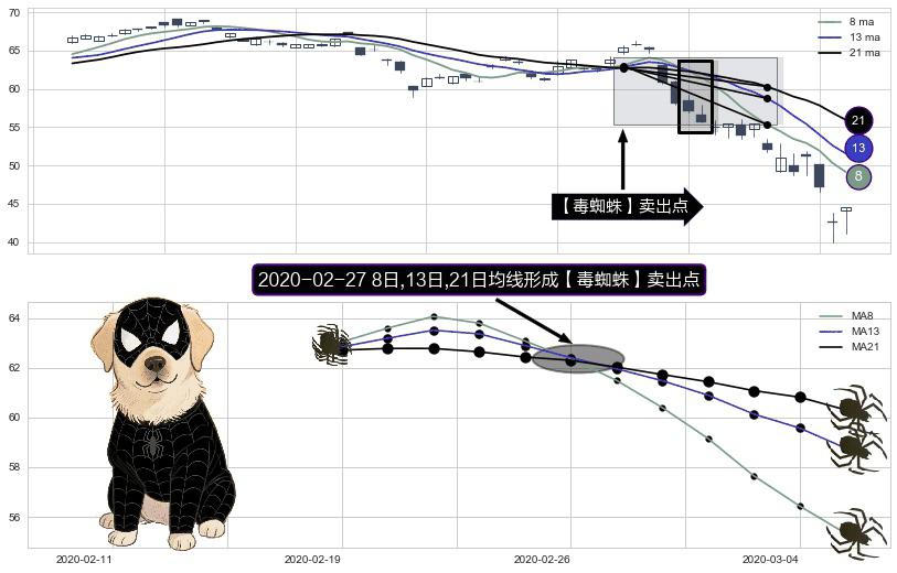形态多维评估: ⚀ 2020-02-27日显现 8日-13日-21日均线 【毒蜘蛛】卖出点 看空信号,后市看跌,卖出