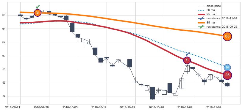 下跌趋势2018-09-21-2018-11-12,均线25, 85确认关键阻力2处