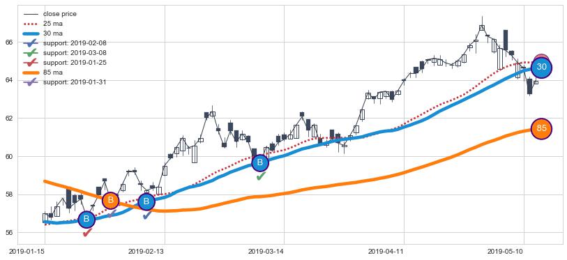 上涨趋势2019-01-15-2019-05-14,均线85, 30确认关键支撑4处