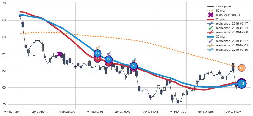 下跌趋势2019-08-01-2019-11-21,均线25, 30确认关键阻力3处