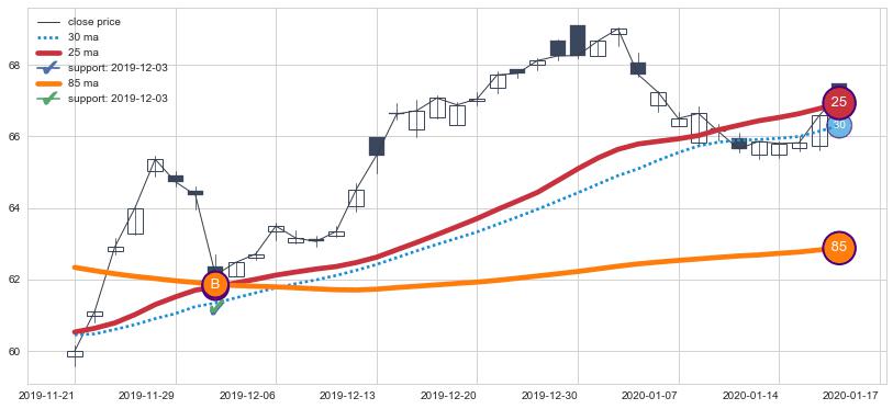 上涨趋势2019-11-21-2020-01-17,均线25, 85确认关键支撑1处