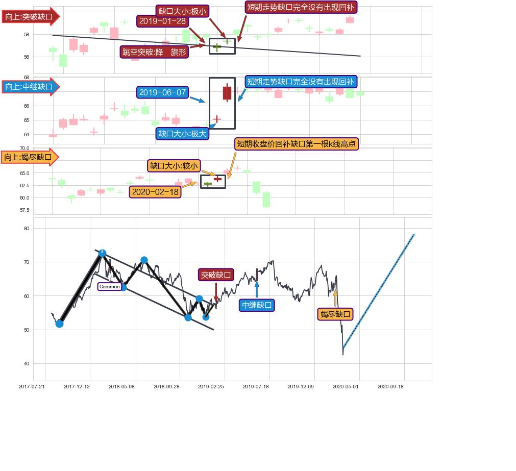 ➣ 缺口后关键走势出现回踩,且后期竭尽缺口依然在缺口位置徘徊