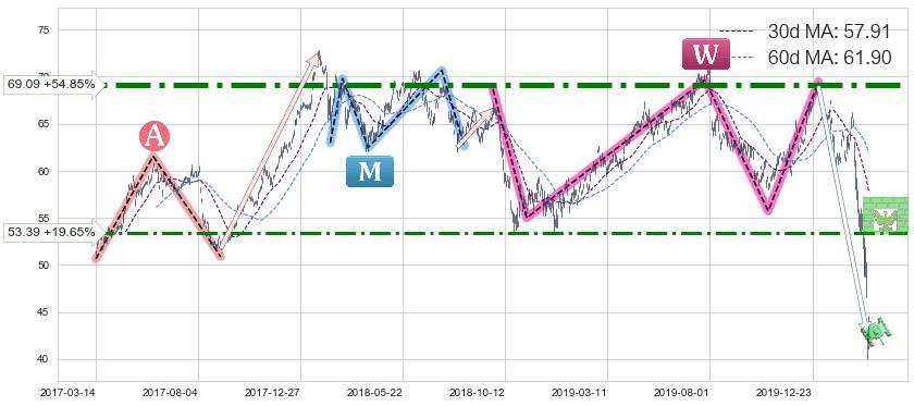 ♘ 阻力价格位69.09,可信任强度89.89%,距离最后交易2020-03-13形成的收盘价格44.62相差 +54.85%
