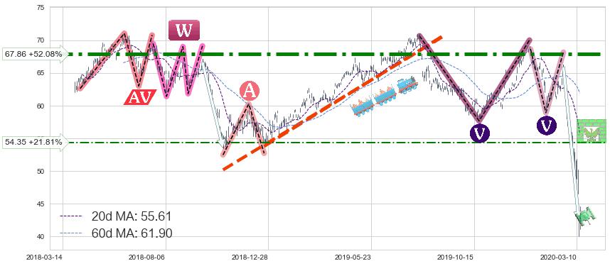 ♘ 阻力价格位67.86,可信任强度99.00%,距离最后交易2020-03-13形成的收盘价格44.62相差 +52.08%