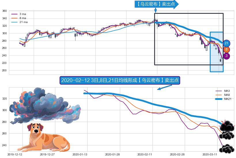⚀ 2020-01-10日-2020-03-13日显现 3日-8日-21日均线 【乌云密布】卖出点 看空信号,后市看跌,卖出