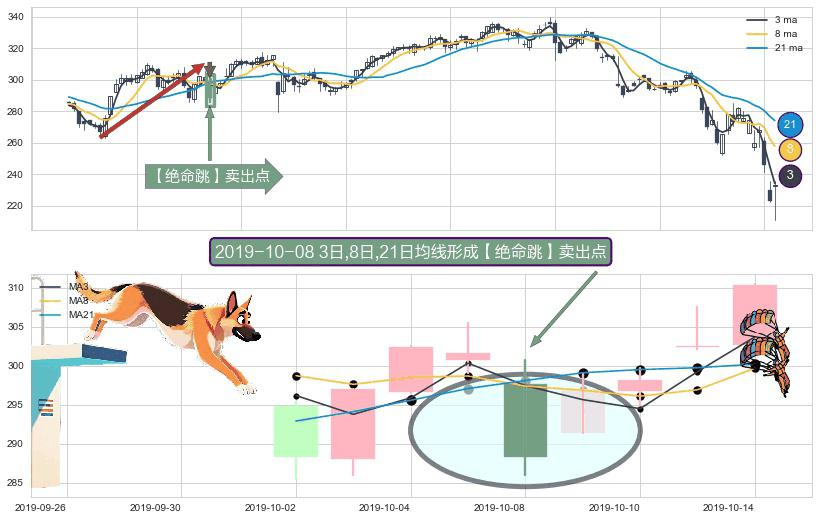 ⚀ 2019-10-08日显现 3日-8日-21日均线 【绝命跳】卖出点 看空信号,后市看跌,卖出