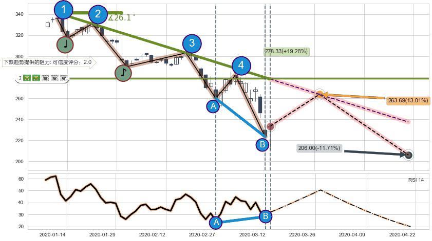 ➣ 预测:2020-04-22,【继续下探】稳定目前下跌趋势的前提下,预测价格:206.00