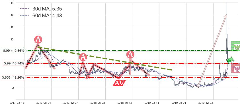 ♘ 支撑价格位5.99,可信任强度65.54%,距离最后交易2020-03-13形成的收盘价格7.20相差 -16.74%