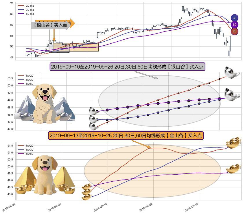 ⚂ 2019-09-16-日至2019-10-25-日显现 20日-30日-60日均线 【金山谷】买入点 其再次确认了买入信号,可靠性更强,买入