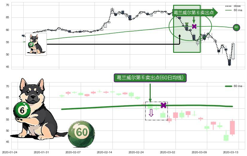 ⚀ 2020-02-25-日显现 葛兰威尔均线 60日均线 第⑥卖出点 走势反转见顶信号,后市看跌,卖出信号