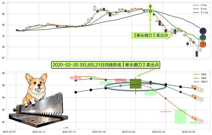 ⚀ 2020-02-20日显现 3日-8日-21日均线 【断头铡刀】卖出点 看空信号,后市看跌,卖出