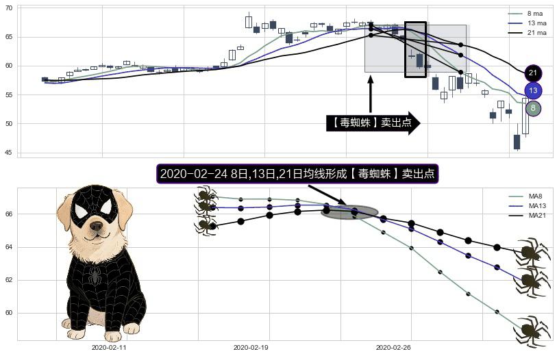 ⚀ 2020-02-24日显现 8日-13日-21日均线 【毒蜘蛛】卖出点 看空信号,后市看跌,卖出