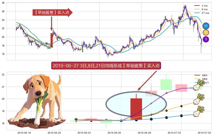 形态多维评估: ⚀ 2019-06-27日显现 3日-8日-21日均线 【旱地拔葱】买入点 看多信号,后市看涨,买入