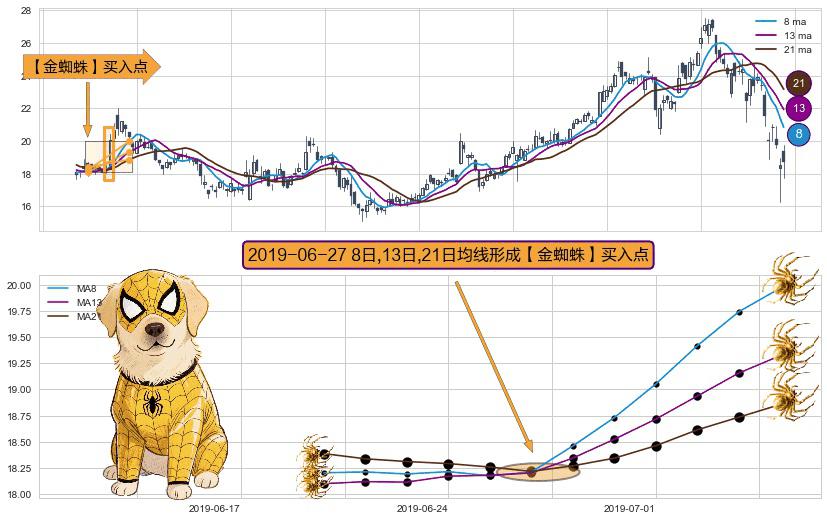 形态多维评估: ⚀ 2019-06-27日显现 8日-13日-21日均线 【金蜘蛛】买入点 看多信号,后市看涨,买入