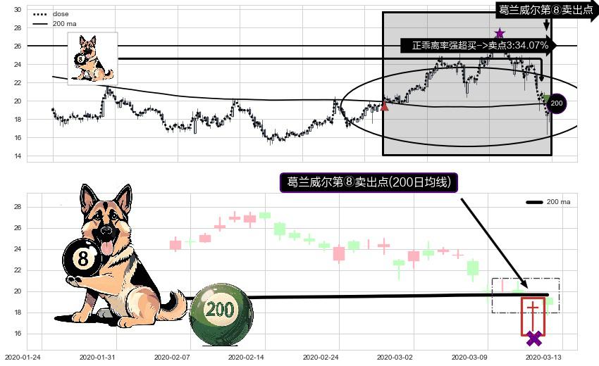 形态多维评估: ⚀ 2020-03-12-日显现 葛兰威尔均线 200日均线 第⑧卖出点 下降趋势的中继信号,后市看跌,卖出信号