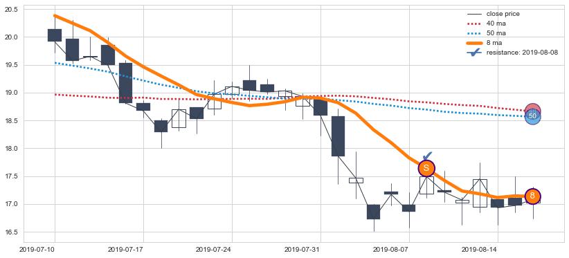 下跌趋势2019-07-10-2019-08-16,均线8确认关键阻力1处