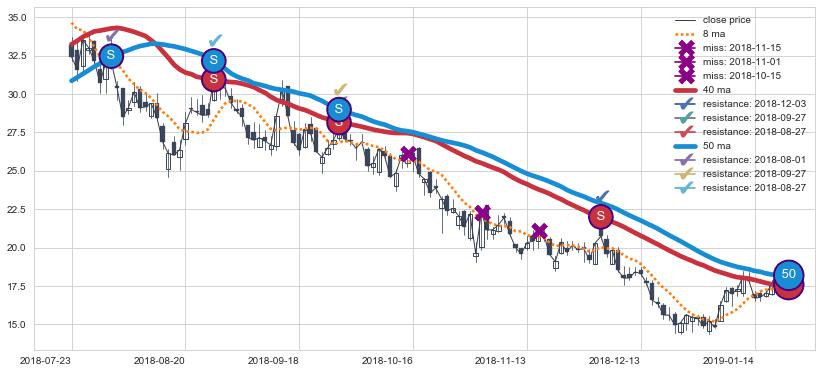下跌趋势2018-07-23-2019-01-18,均线40, 50确认关键阻力4处
